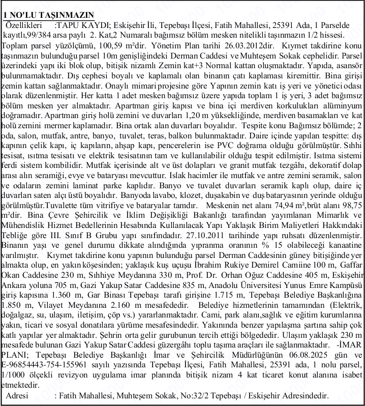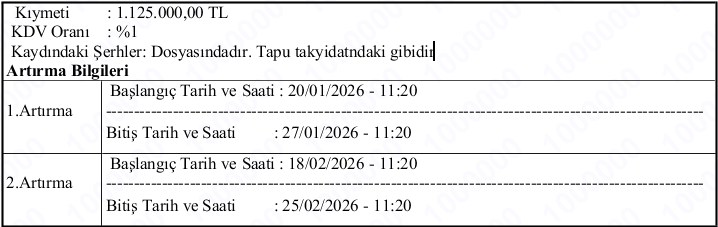 Bir borçtan dolayı aşağıda cins, miktar ve değerleri yazılı mallar satışa çıkarılmış olup mahcuzun ayrıntılı görsellerine, artırmaya ilişkin şartlara ve ayrıntılı açıklamalara esatis.uyap.gov.tr adresi üzerinden 2025/50551 ESAS sayılı dosya numarası ile erişim sağlanabilir.