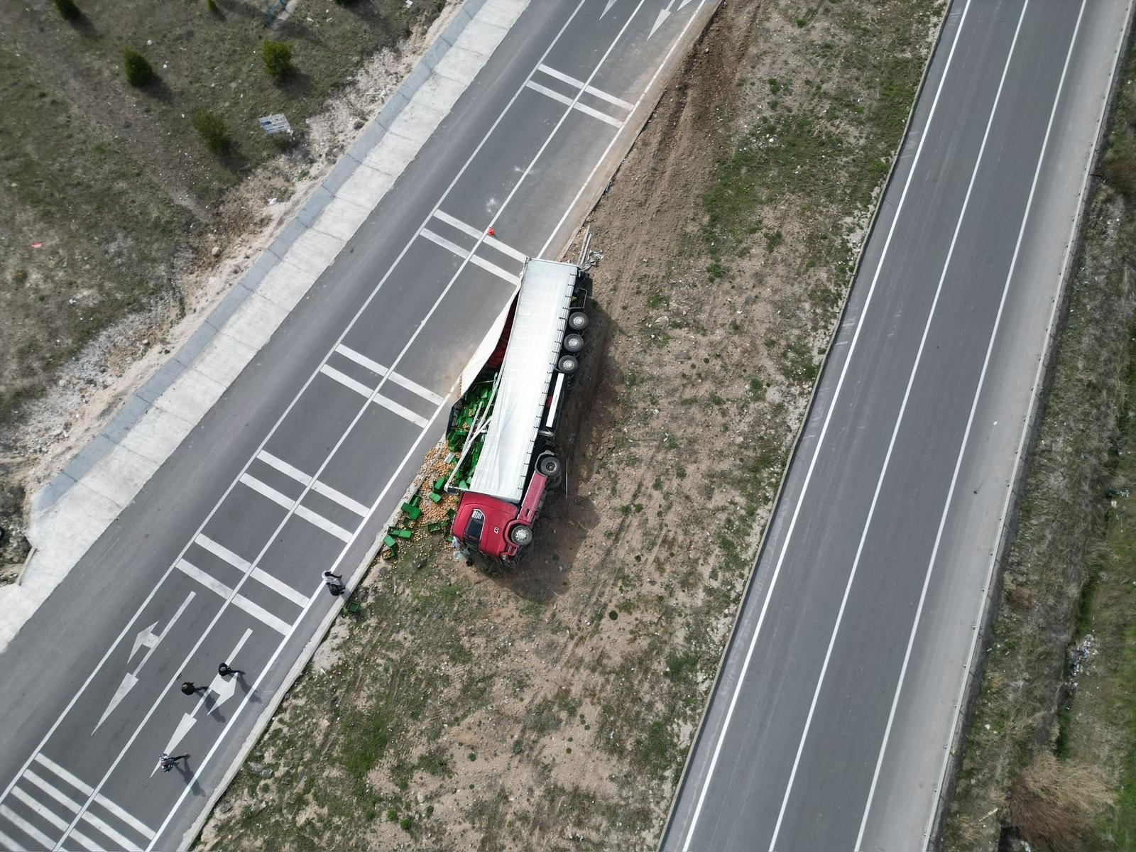 Bolvadin Organize Sanayi Bölgesi (OSB) Kavşağı’nda meydana geldi. Edinilen bilgilere göre, A.K. idaresindeki patates yüklü tır, sürücüsünün henüz belirlenemeyen bir nedenle direksiyon hâkimiyetini kaybetmesi sonucu kontrolden çıkarak refüje devrildi.