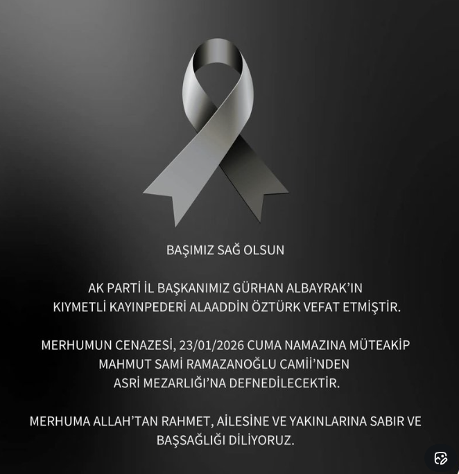 AK Parti Çifteler tarafından yapılan açıklamada AK Parti Eskişehir İl Başkanı Gürhan Albayrak'ın kayınpederi Alaattin Öztürk hayatını kaybettiğini duyurdu. Vefat haberi, teşkilat mensupları ve sevenleri arasında üzüntüyle karşılandı.