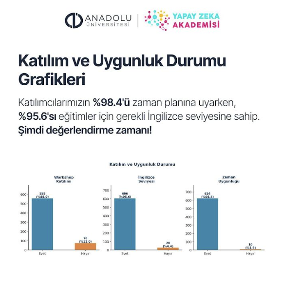 Anadolu Üniversitesi Yapay Zekâ Akademisi’ne rekor başvuru yapıldı.Başvuruların yüzde 84,9’unu öğrenciler oluştururken, yüzde 15,1’lik kısmı akademisyen ve öğretim elemanlarından geldi. En fazla başvuru yapılan bölümler arasında Yazılım, Uygulama Geliştirme ve Çözümleme, İşletme ile İktisat ilk sıralarda yer aldı. Katılımcıların yüzde 98,4’ünün programın zaman planına uyum sağlayabileceği, yüzde 95,6’sının ise eğitimler için gerekli İngilizce yeterliliğe sahip olduğu belirlendi.