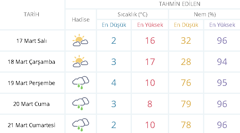 Bayram tatilinde Eskişehir'de hava durumu nasıl olacak? Arife günü sıcaklıkların düşmesi beklenirken, bayram boyunca sağanak yağışın devam etmesi bekleniyor. Ramazan Bayramı’nın ikinci günü olan 21 Mart Cumartesi, Eskişehir’de kapalı ve yağışlı bir hava etkili olacak. Gündüz sıcaklıklarının 9°C civarında seyretmesi beklenirken, sabah ve akşam saatlerinde serinlik hissedilecek. Bu nedenle dışarı çıkmayı planlayanların yanlarında şemsiye bulundurmaları ve daha kalın kıyafetler tercih etmeleri iyi bir fikir olabilir.