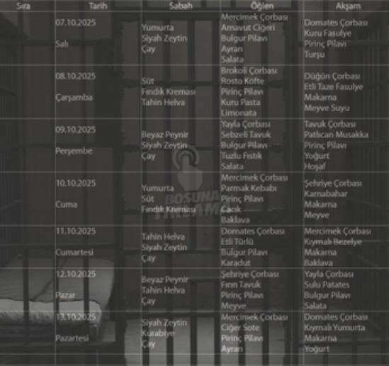 Adalet Bakanlığı tarafından konuyla ilgili henüz bir açıklama yapılmadı. Listeye göre mahkûmlara verilen yemekler arasında tas kebabı, tavuk sote, mercimek çorbası, pirinç pilavı, makarna, yoğurt ve tatlı gibi kalemler yer alıyor.