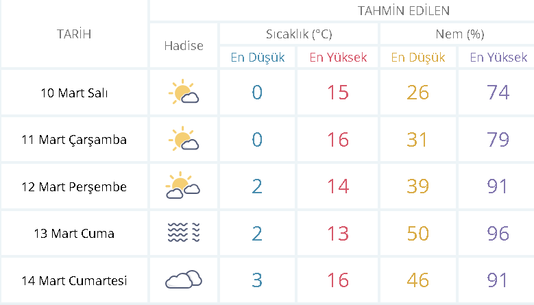 Haftanın ilerleyen günlerinde de Bilecik’te parçalı bulutlu havanın etkisini sürdürmesi bekleniyor. 11 Mart Çarşamba günü sıcaklığın 16 dereceye kadar yükselmesi, 12 Mart Perşembe günü ise 14 derece civarında seyretmesi tahmin ediliyor. Uzmanlar, sabah ve gece saatlerinde hava sıcaklığının düşük olması nedeniyle vatandaşların özellikle erken saatlerde soğuk havaya karşı tedbirli olmaları gerektiğini belirtiyor.