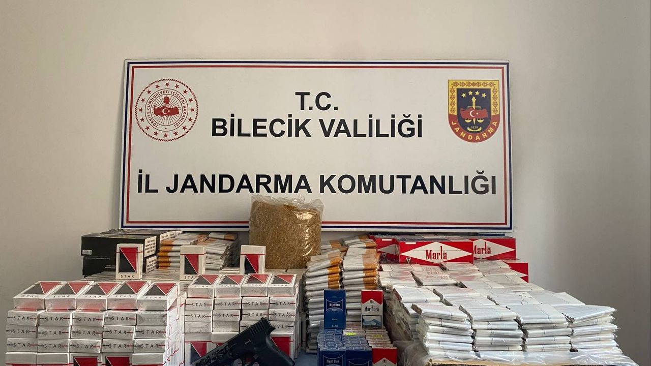 Bilecik İl Jandarma Komutanlığı ekiplerince Osmaneli ilçesinde bir şüpheliye ait 3 ayrı adreste yapılan aramalarda; 1 adet ruhsatsız tabanca, 1 adet şarjör, 6 adet 7.65 mm tabanca fişeği, 21 bin 560 adet dolu makaron, 8 bin 600 adet boş makaron, 5 kilogram kıyılmış tütün ve 230 adet 20’lik boş sigara paketi bulundu.