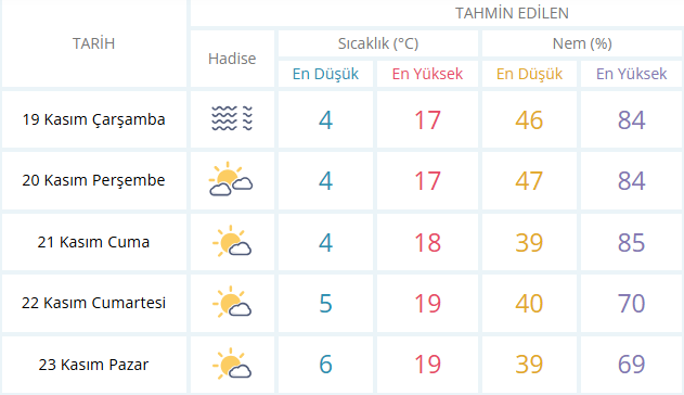Meteoroloji, sıcaklıkların bugün önemli bir değişiklik göstermeyeceğini, kent merkezinde 17 derece civarında seyredeceğini açıkladı. Gün içinde yağış beklentisi yok. Rüzgârın ise güney ve doğu yönlerden hafif ve orta kuvvette esmesi öngörülüyor.