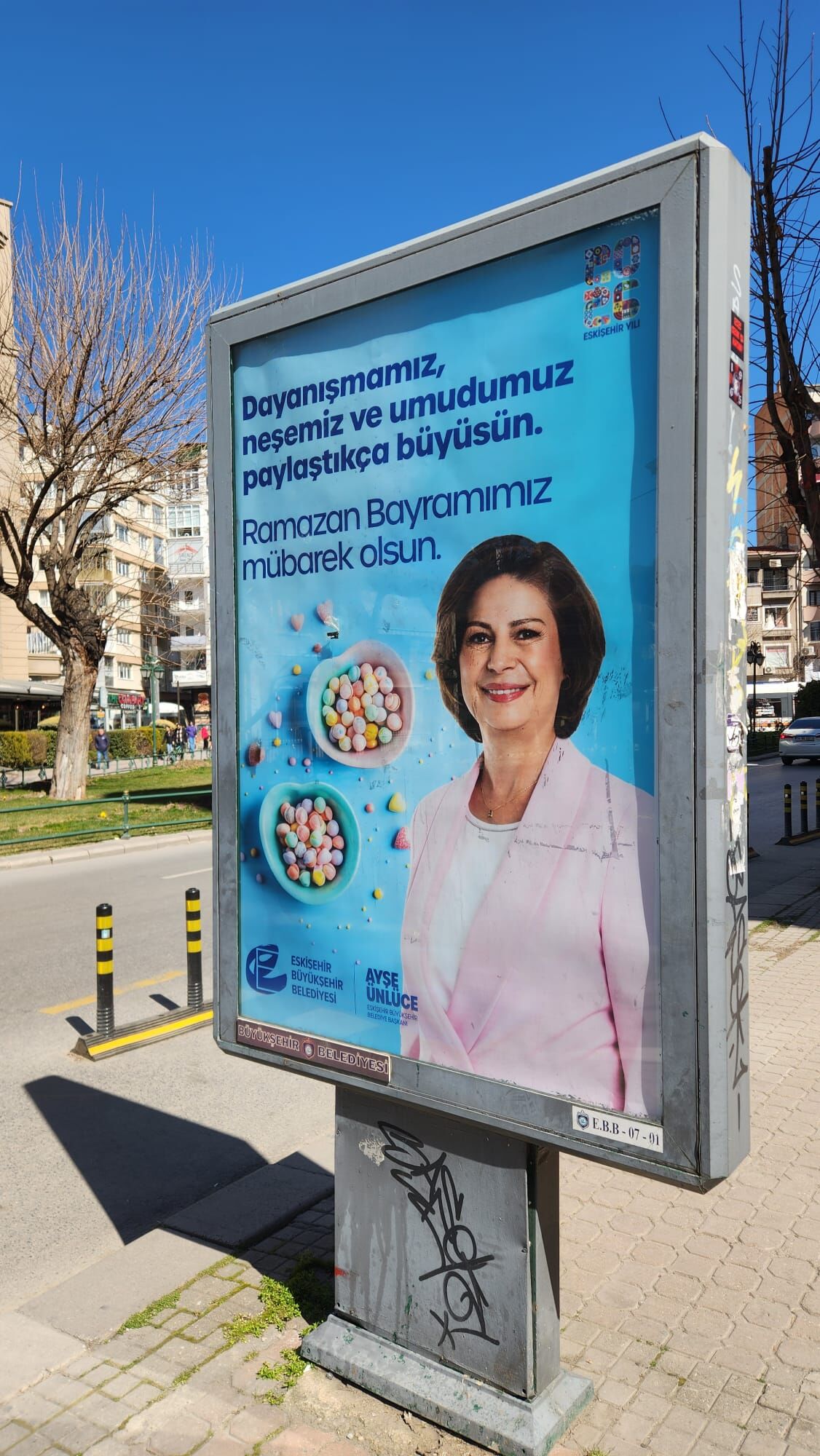 Eskişehir genelinde billboard ve reklam panolarına yerleştirilen mesajlarda, “Dayanışmamız, neşemiz ve umudumuz paylaştıkça büyüsün. Ramazan Bayramımız mübarek olsun” ifadelerine yer verildi.