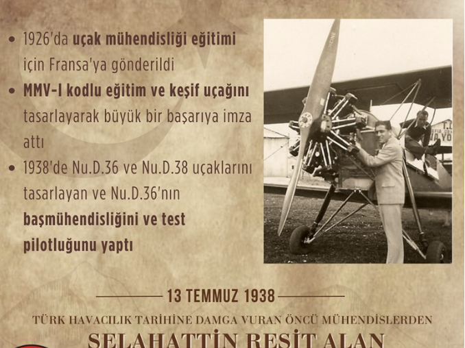 İlk Türk Uçak Mühendisi olan, 1901 yılında Makedonya’nınPirlepe şehrinde doğan Selahattin Reşit Alan’dır. Türk Tayyare Cemiyeti (T.Ta.C.) tarafından, uçak mühendisliği eğitimi için 1926 yılında Fransa’ya gönderilen ilk 5 kişilik grup arasındadır.