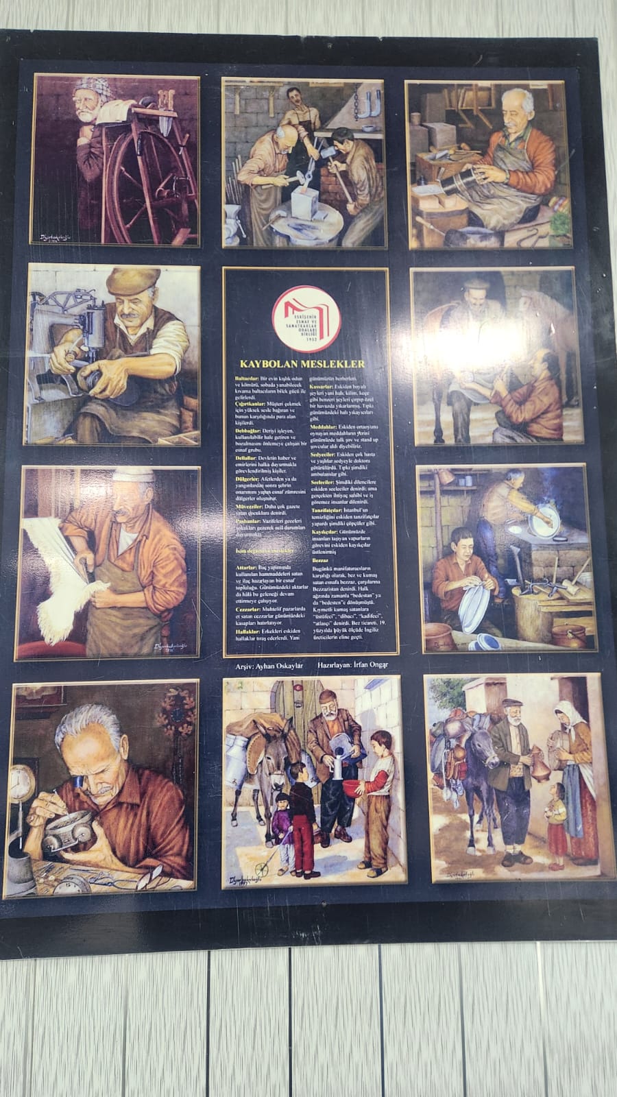 Eskişehir Esnaf ve Sanatkârlar Odası binasında asılı bulunan “Kaybolan Meslekler” temalı tablo, geçmişten günümüze uzanan zanaat kültürünü gözler önüne seriyor. Odayı ziyaret edenlerin dikkatini çeken eser, el emeğine dayalı mesleklerin gündelik yaşam içindeki halini resmediyor.