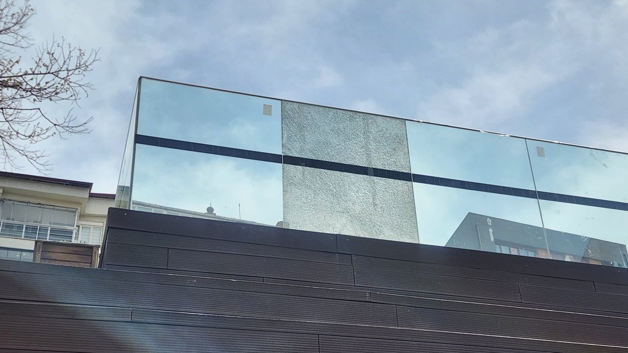 Eskişehir'de merdivenlerin üst kısmında yer alan cam yüzeyin parçalanmış halde olması hem görüntü kirliliğine neden olurken hem de özellikle çocuklar için risk oluşturuyor.