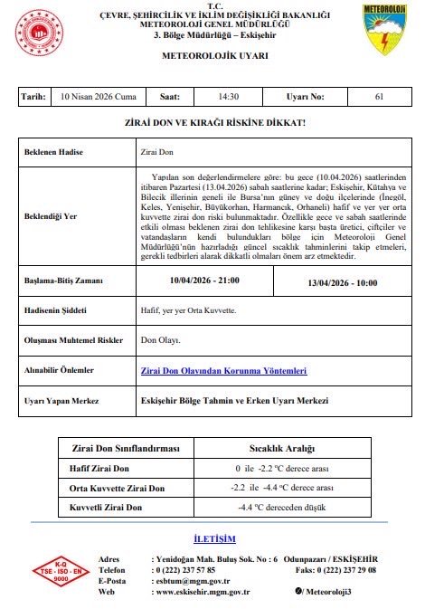 Yapılan açıklamaya göre, 10 Nisan 2026 Cuma günü saat 21.00’den 13 Nisan 2026 Pazartesi günü saat 10.00’a kadar Eskişehir genelinde hafif, yer yer ise orta kuvvette zirai don bekleniyor. Özellikle gece ve sabah saatlerinde etkili olması öngörülen don olayının, tarımsal faaliyetleri olumsuz etkileyebileceği belirtildi. Yetkililer, başta çiftçiler ve üreticiler olmak üzere tüm vatandaşların dikkatli ve tedbirli olması gerektiğini vurguladı. Güncel hava tahminlerinin yakından takip edilmesi ve gerekli önlemlerin alınmasının önemine dikkat çekildi.