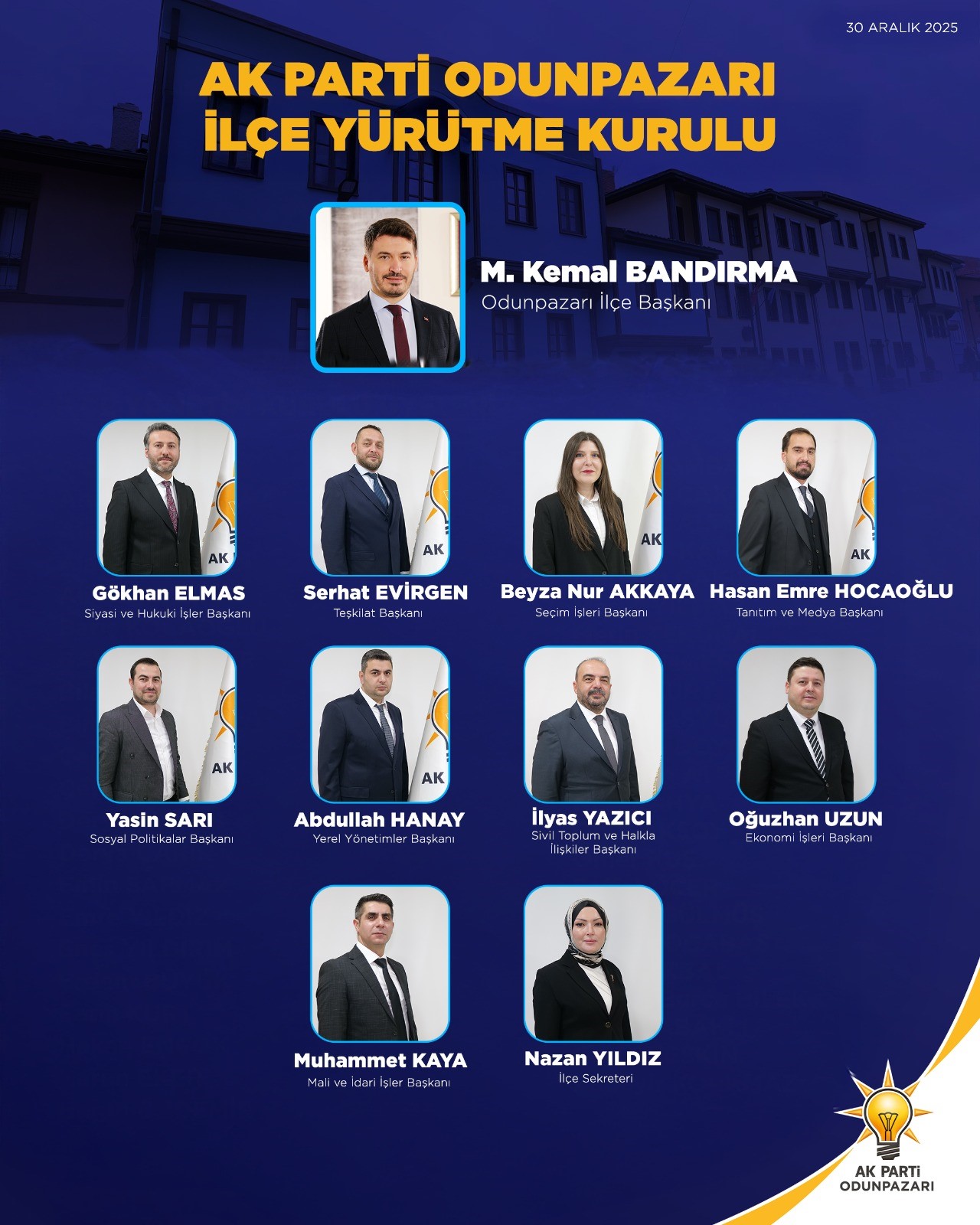 AK Parti Eskişehir Odunpazarı İlçe Başkanlığı’nın yeni Yürütme Kurulu Listesi kamuoyuyla paylaşıldı. İlçe Başkanı Mustafa Kemal Bandırma başkanlığında oluşturulan listede, teşkilatın farklı alanlarında görev alacak isimler belli oldu.