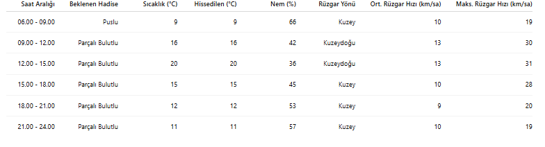 Sabah saatlerinde sıcaklık 9°C civarında ölçülürken, öğle saatlerine doğru 20°C seviyelerine kadar çıkacak. Günün en düşük sıcaklığı ise gece saatlerinde 11°C civarında olacak.
