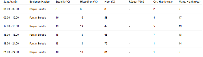 Sabah saatlerinde sıcaklık 8°C civarında ölçülürken, öğle saatlerine doğru 19°C seviyelerine kadar yükselecek. Günün en düşük sıcaklığı ise gece saatlerinde 10°C civarında olacak.