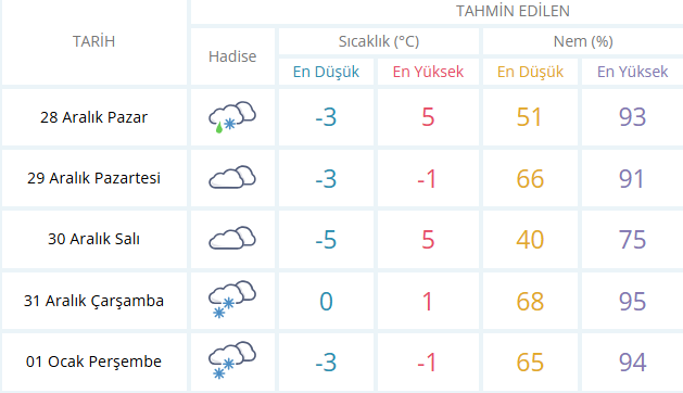 Meteorolojiye göre günün en yüksek hava sıcaklıkları 1-3 derece artarken, gece sıcaklıkları 2-4 derece azalacak. Batı ve güneybatı yönlerden esmesi beklenen rüzgârın, öğle saatlerinden sonra batı ve kuzeybatıya dönerek kısa süreli kuvvetli hamleler (30-50 km/saat) yapacağı öngörülüyor. Özellikle iç ve yüksek kesimlerde tipi şeklinde kar yağışı ile buzlanma ve don olaylarına karşı dikkatli olunması isteniyor.