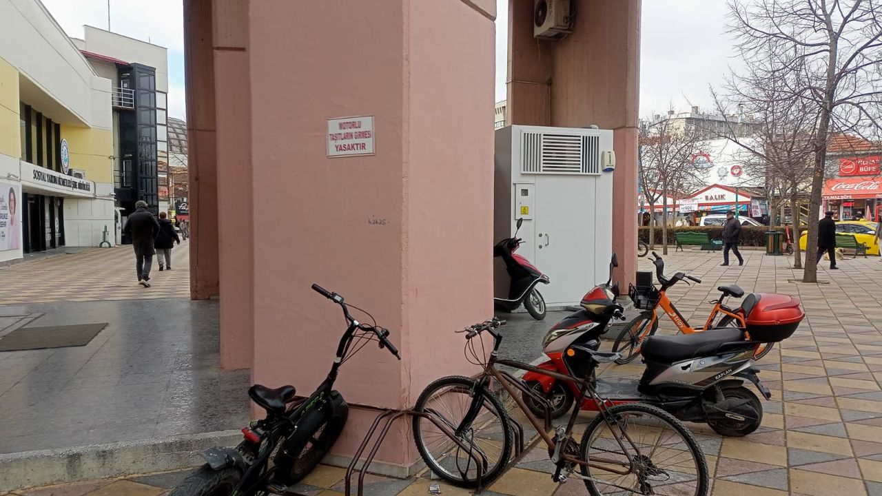 Kolon üzerinde açıkça yer alan uyarı levhasına rağmen bisikletlerin demirlere kilitlendiği, motosikletlerin ise bina altına bırakıldığı gözlemlendi. Gün boyunca çok sayıda kişinin kullandığı geçiş alanında oluşan bu durum, dikkat çekici bir görüntü oluşturdu.
