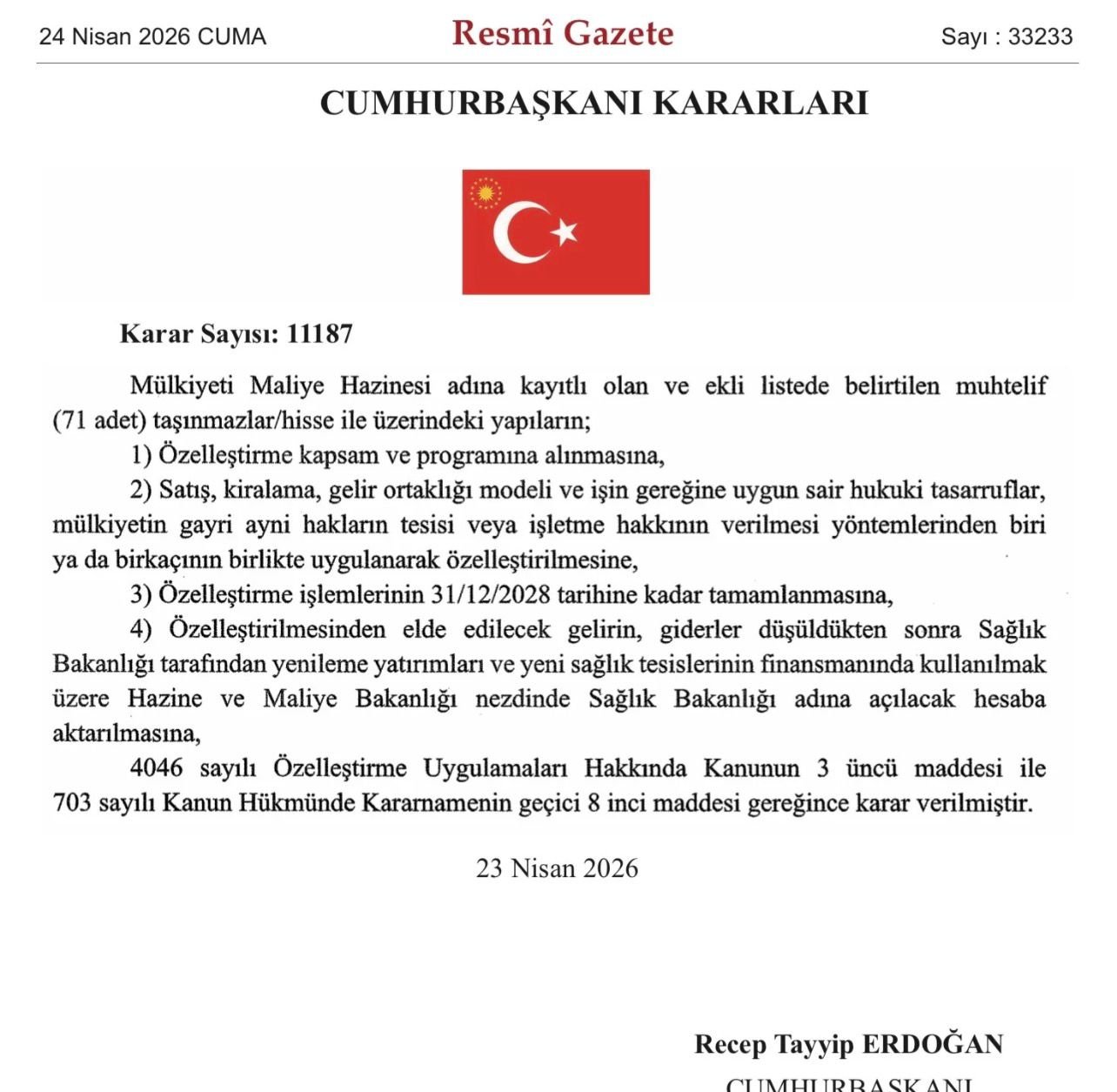 Resmi Gazete’de yer alan ve “Karar Sayısı: 11187” olarak yayımlanan düzenlemeye göre; Maliye Hazinesi adına kayıtlı olan ve ekli listede belirtilen toplam 71 taşınmaz ve üzerindeki yapıların özelleştirme kapsamına alınmasına karar verildi. Sürecin 31 Aralık 2028 tarihine kadar tamamlanması öngörülürken, elde edilecek gelirin Sağlık Bakanlığı’nın yeni yatırımları ve sağlık tesislerinin finansmanında kullanılacağı belirtildi. Öte yandan, Eskişehir’de sağlık alanındaki özelleştirme kararlarının yeni olmadığına dikkat çekiliyor. Daha önce eski Eskişehir Devlet Hastanesi arazisinin de özelleştirme programına alınması kentte tartışmalara yol açmış, sivil toplum kuruluşları ve meslek odaları konuyla ilgili çeşitli açıklamalarda bulunmuştu.