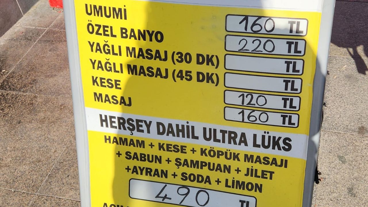 Eskişehir’de hizmet veren bazı hamamlarda güncel fiyatlar dikkat çekiyor. Erkeklere özel hizmet veren işletmelerde umumi banyo 160 TL, özel banyo 220 TL, yağlı masaj 120–160 TL, ve “her şey dahil ultra lüks” paket ise 490 TL olarak belirtiliyor.