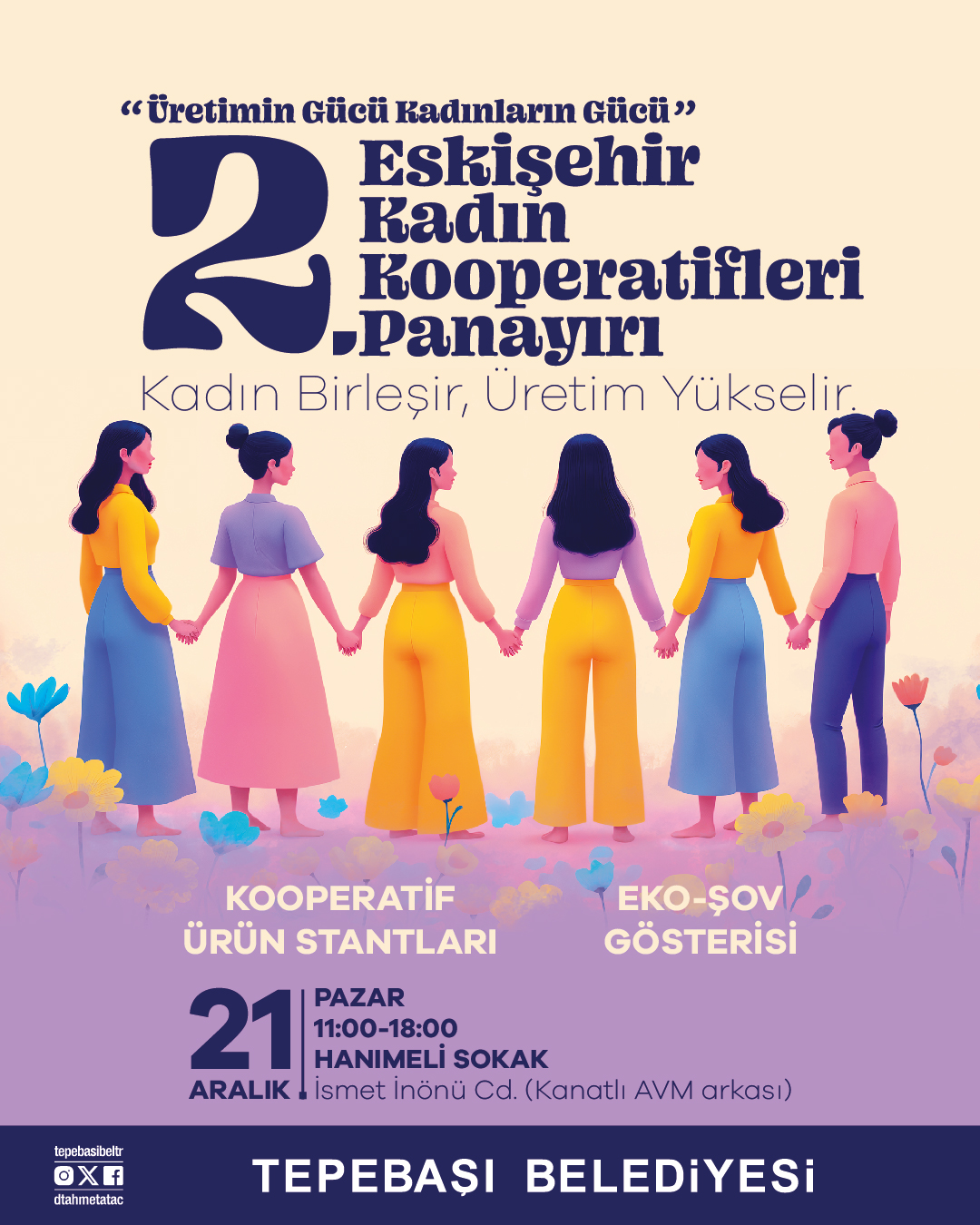 Tepebaşı Belediyesi, 21 Aralık Dünya Kooperatifçilik Günü kapsamında Eskişehir Kadın Kooperatifleri Panayırının bu yıl ikincisini düzenliyor. “Üretimin Gücü Kadınların Gücü” sloganıyla gerçekleştirilecek etkinlik, 21 Aralık Pazar günü 11.00-18.00 saatleri arasında İsmet İnönü Caddesi üzerindeki Hanımeli Sokağı’nda (Kanatlı AVM arkası) Eskişehirlilerle buluşacak.