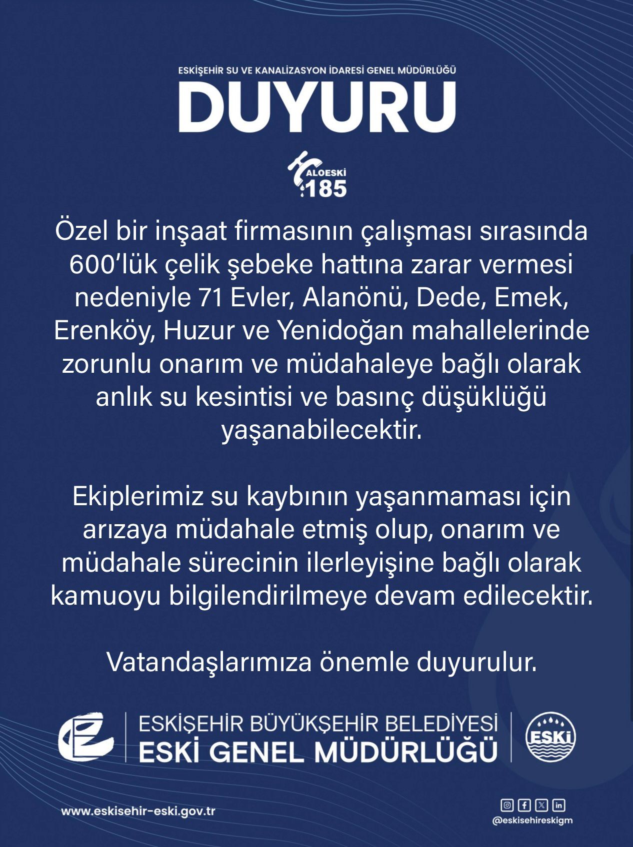 Yaşanan hasar nedeniyle 71 Evler, Alanönü, Dede, Emek, Erenköy, Huzur ve Yenidoğan mahallelerinde anlık su kesintileri ile birlikte su basıncında düşüş yaşanabileceği bildirildi. Yetkililer, kesintinin süresinin onarım çalışmalarının seyrine göre değişebileceğini vurguladı.