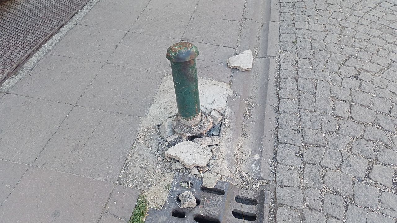 Eskişehir İki Eylül Caddesi’nde kaldırım kenarındaki dubalardan biri, taban kısmından hasar görerek etrafındaki beton zeminiyle birlikte parçalanmış halde duruyor. Çevresine saçılan taş parçaları ve gevşek zemin, hem yayalar için hem de cadde kenarındaki mazgala yaklaşan araçlar açısından risk oluşturuyor.