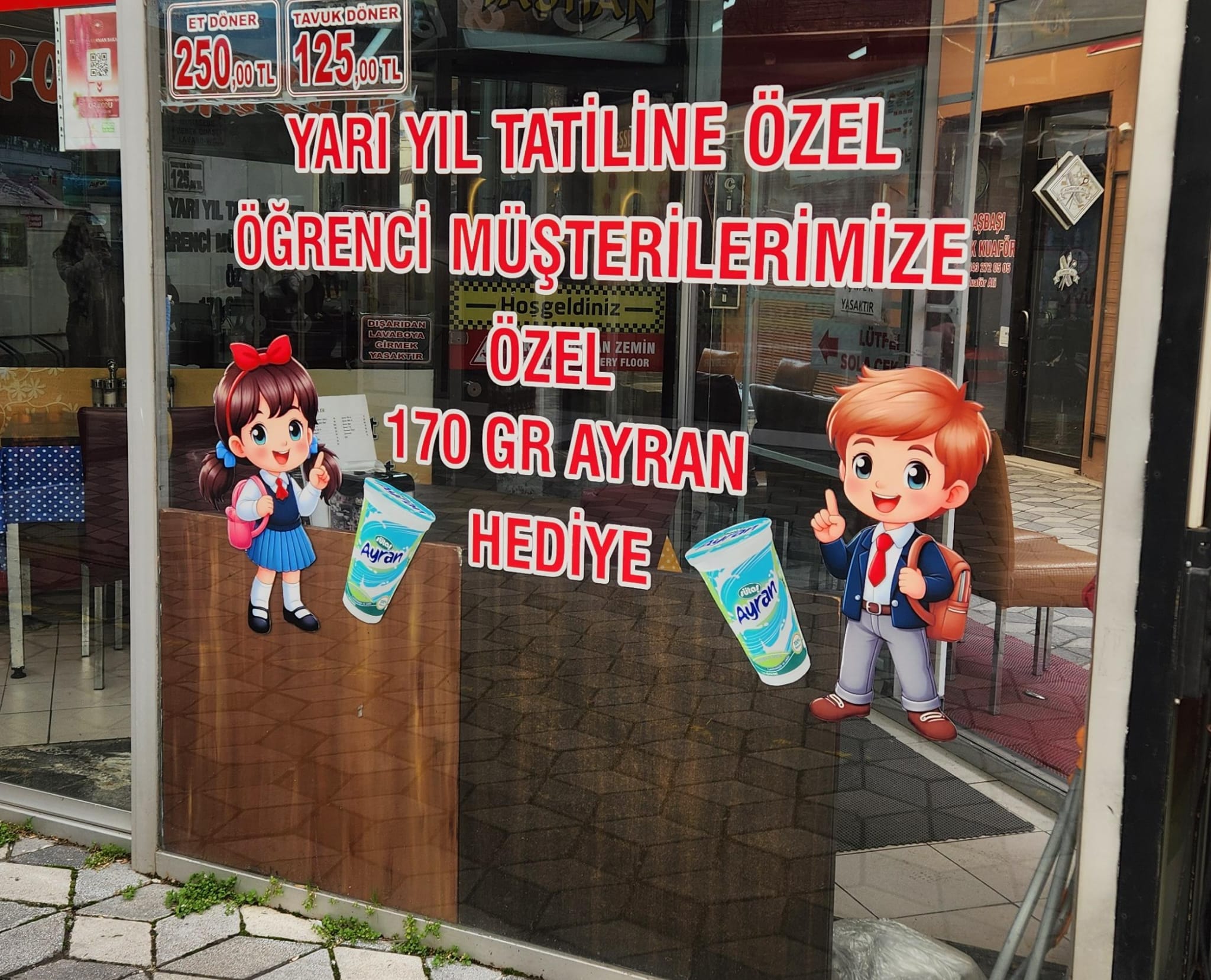 Eskişehir kent merkezinde faaliyet gösteren bir işletme, yarıyıl tatiline giren öğrenciler için dikkat çeken bir kampanya başlattı. İşletmenin camına asılan afişte, yarım ekmek arası tavuk dönerin 100 TL’den satışa sunulduğu ve 170 gram ayranın ücretsiz verildiği duyuruldu.