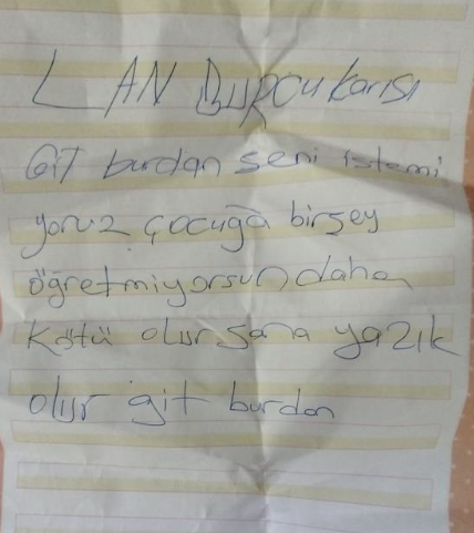 Dün ise okulun kapısına bırakılan tehdit notunda, “Lan Burcu karısı, git buradan, seni istemiyoruz. Çocuğa bir şey öğretmiyorsun. Daha kötü olur, sana yazık olur” ifadelerine yer verildi. Tedirginlik yaşayan öğretmenlerin suç duyurusunda bulunmasının ardından Eskişehir Cumhuriyet Başsavcılığı, ‘Kamu Görevlisine Tehdit ve Hakaret’ suçlarından soruşturma başlattı. Kimliği belirlenen şüpheli, kolluk kuvvetleri tarafından yakalanarak adli makamlara sevk edildi ve tutuklanarak ceza infaz kurumuna teslim edildi.