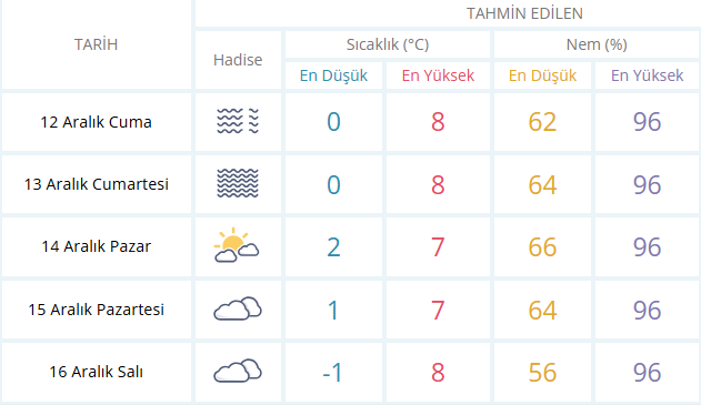 Gün ilerledikçe sisin etkisini kaybetmesi, hava durumunun parçalı bulutlu bir seyre dönüşmesi bekleniyor. Güneş zaman zaman bulutların arasından yüzünü gösterecek ancak kent genelinde açık bir hava hâkim olmayacak. Sıcaklıkların mevsim normallerinin üzerinde seyretmesi nedeniyle gün içinde hissedilen hava, soğuk kış günlerine kıyasla daha yumuşak olacak.