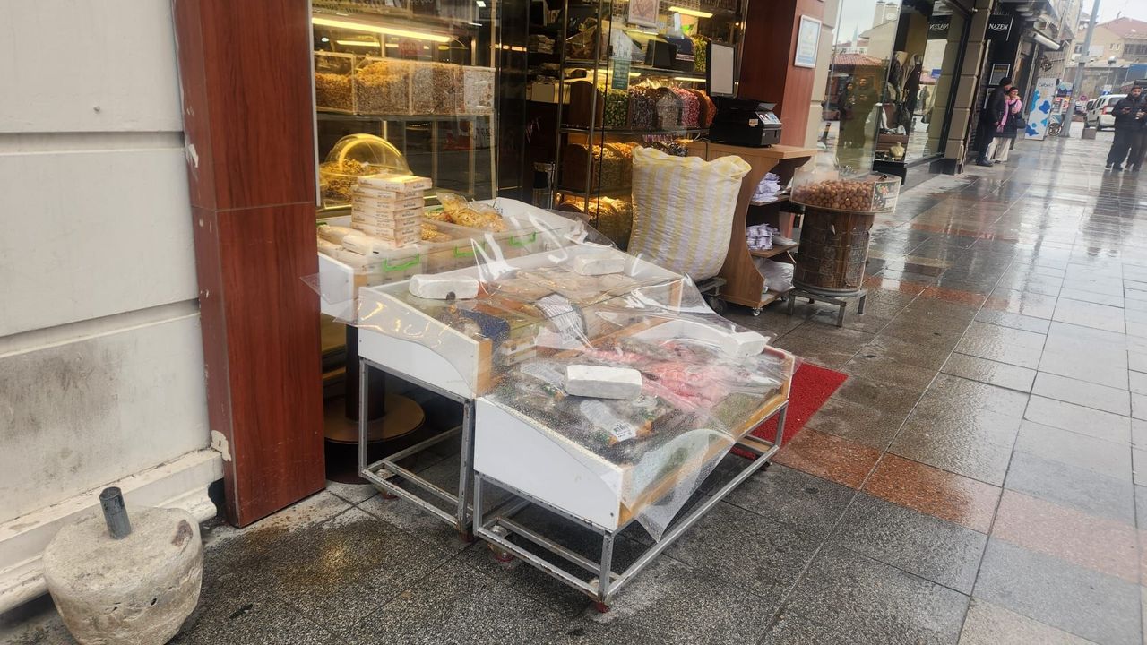 Eskişehir'de özellikle açık alanda satış yapan işletmeler, ürünlerini korumak için tezgâhlarının üzerini brandalarla kapattı. Yağmurdan etkilenmemesi için naylon örtülerle sarılan ürünler, hem ıslanmaktan hem de zarar görmekten bu şekilde korunmaya çalışıldı.