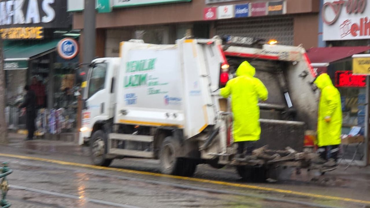 Eskişehir'de dün aniden etkisini gösteren şiddetli yağış, cadde ve sokaklarda su birikintilerine neden oldu. Yağışa hazırlıksız yakalanan vatandaşlar kapalı alanlara sığınırken, sahada görev yapan belediye personeli çalışmalarına ara vermedi. Odunpazarı Belediyesi Temizlik İşleri Müdürlüğüne bağlı çöp toplama ekipleri, sağanak nedeniyle zor anlar yaşadı. Çöp kamyonlarının arkasında seyir halinde görev yapan işçiler, yağıştan korunmak amacıyla yağmurluklarını giyerek güzergahlarındaki çöpleri toplamaya devam etti. Ekiplerin, özellikle tramvay yollarının da bulunduğu ıslak ve kaygan zeminde, kent hijyeninin aksamaması için gösterdiği yoğun çaba dikkat çekti. Halk sağlığı ve çevre temizliği için yağışa aldırış etmeden çalışan personelin o anları ise objektiflere yansıdı.