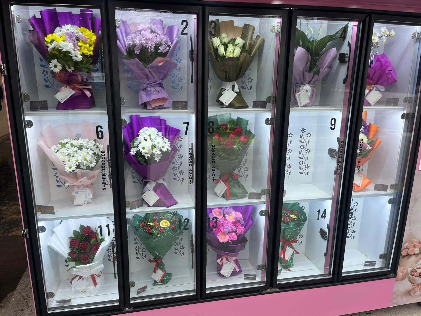 Anadolu Üniversitesi Yunus Emre Kampüsü’nde rektörlük binasına yakın bir noktaya kurulan çiçek otomatı, Eskişehir’de faaliyet gösteren bir çiçekçi tarafından hayata geçirildi. Otomatın içinde yer alan hazır buketleri görenler, durup incelemeden geçemiyor. Kredi kartı ile ödeme yapılan sistemde çiçek fiyatlarının 750 ile bin 250 TL arasında değiştiği görülüyor. Özellikle kız öğrencilerin yoğun ilgi gösterdiği otomat, kampüs içinde farklı bir deneyim sunarken fiyatlar ise tartışma konusu oldu.