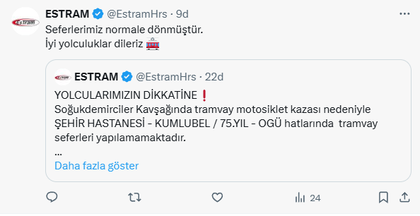 Çarpışma sonrası tramvay seferlerinde aksamalar yaşandı. Şehir Hastanesi-Kumlubel ile 75. Yıl-Osmangazi Üniversitesi hattındaki seferler, ESTRAM ekiplerinin müdahalesiyle kısa sürede normale döndü. Kazayla ilgili polis ekipleri inceleme başlattı.