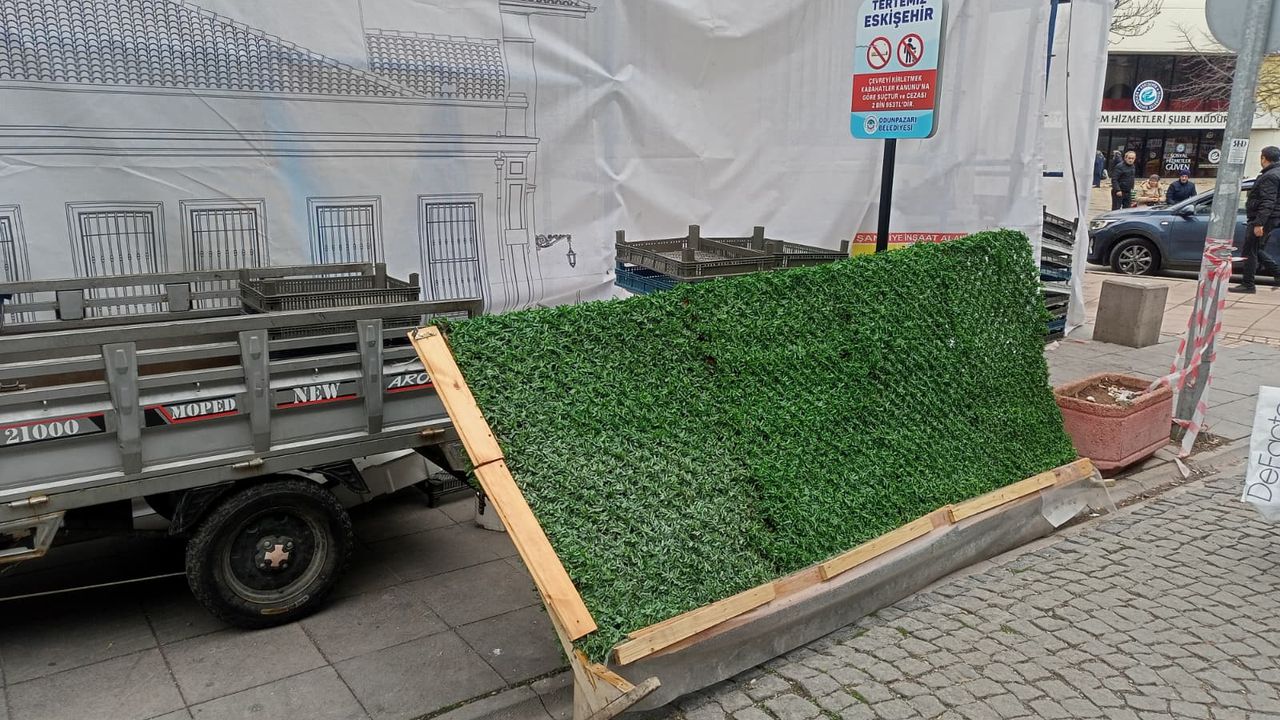 Eskişehir'in yol kenarına bırakılan ahşap malzemeler ve yeşil kaplama panelleri nedeniyle kaldırımın önemli bir bölümü kullanılamaz hale geldi.