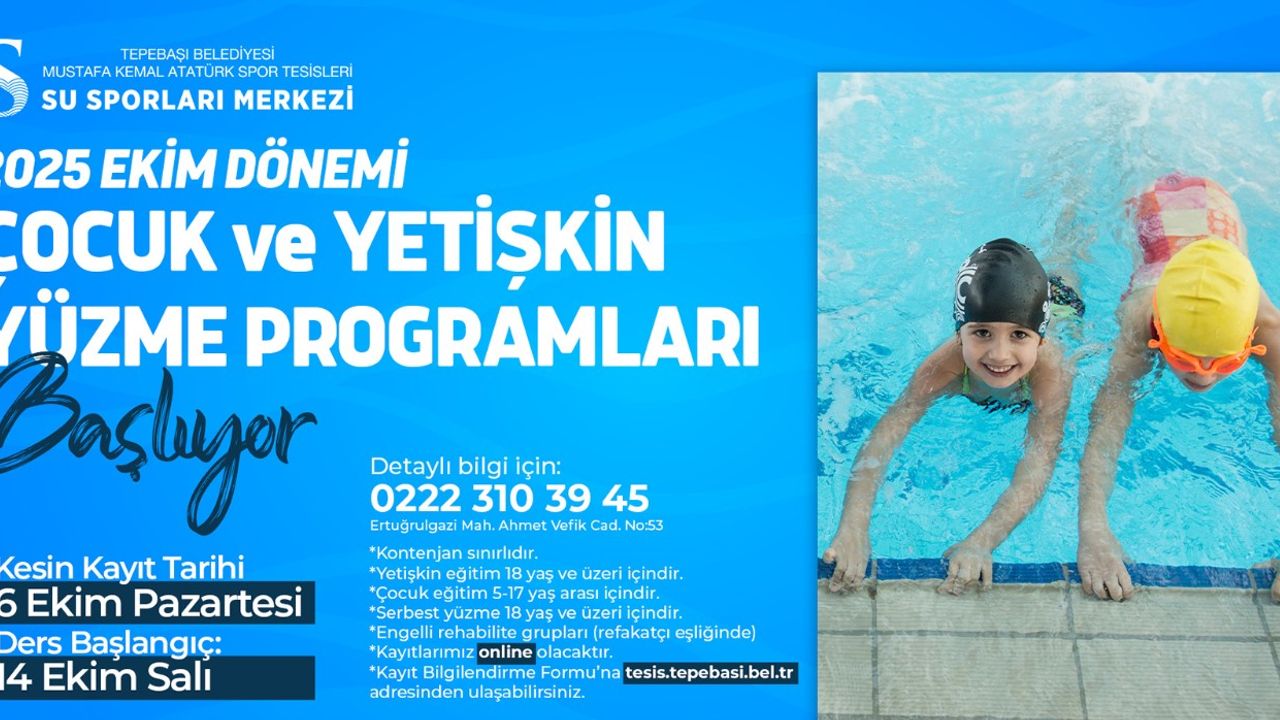 Tepebaşı Belediyesi, çocuklar ve yetişkinler için düzenlediği yüzme kurslarına Ekim ayında da devam ediyor. Uluslararası Leed Sertifikalı yeşil bina özelliğine sahip Mustafa Kemal Atatürk Spor Tesisleri Su Sporları Merkezi, 2025 Ekim dönemi yüzme kursları için yeni başvuru sürecini başlatıyor. 5-17 yaş arası çocuklar ile 18 yaş ve üzeri yetişkinlere yönelik yüzme eğitimlerinin kayıtları 6 Ekim Pazartesi günü online olarak başlayacak. Kurslara katılmak isteyenler, https://tesis.tepebasi.bel.tr/