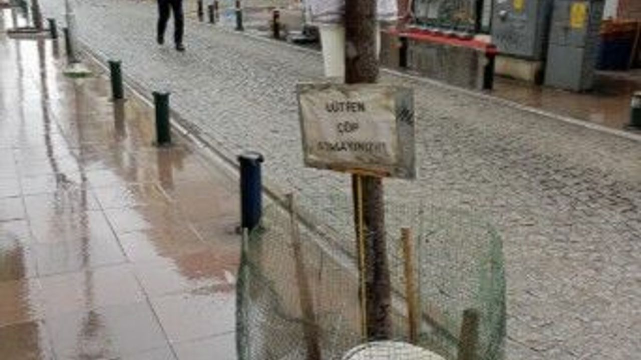Görüntülerde, ağacın çevresinin tel ile çevrildiği ve içerisine çeşitli atıkların bırakıldığı görülürken, bu duruma karşı yapılan uyarı yazısının dikkat çektiği gözlemlendi. Özellikle yoğun kullanılan sokakta yer alan bu uyarı, çevreye karşı duyarlılık çağrısı niteliği taşıyor.