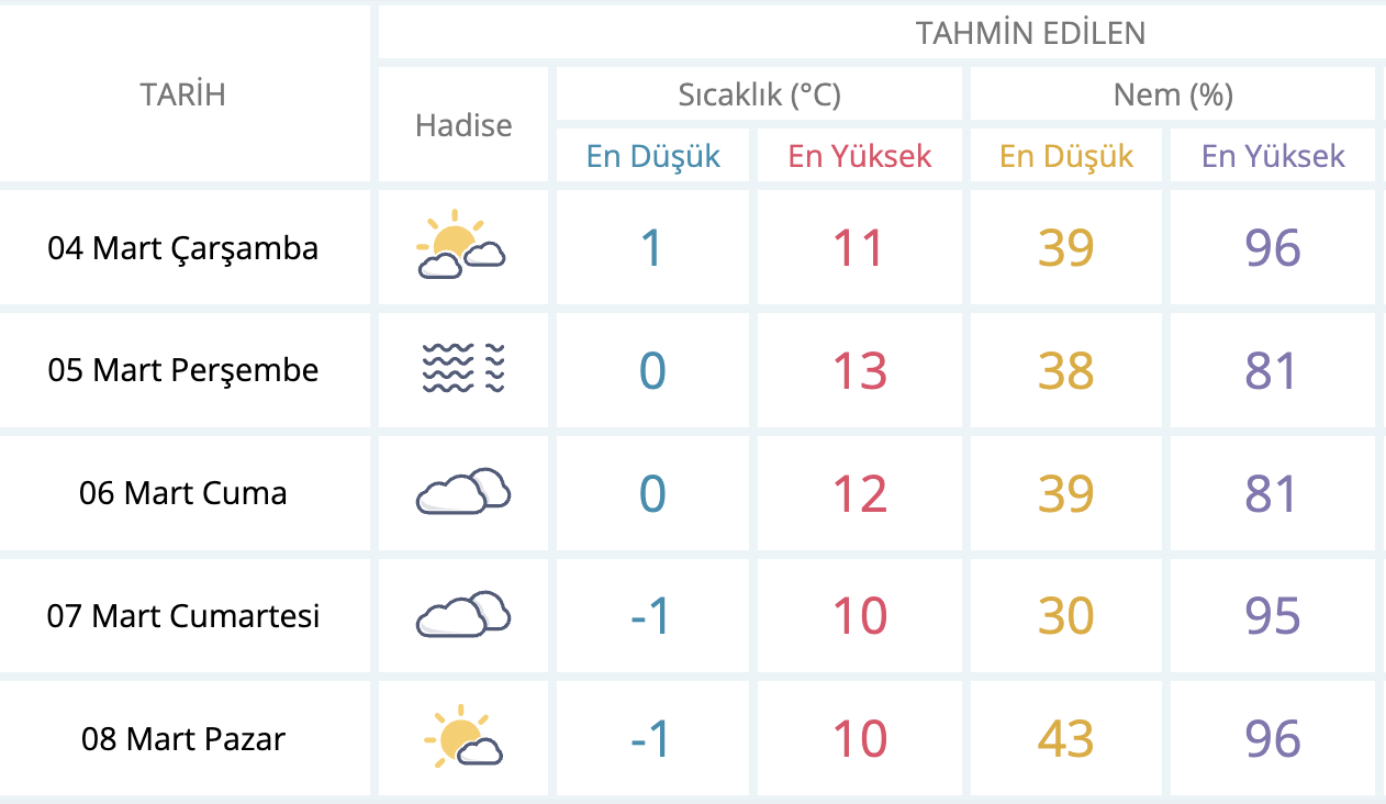 Öğleden itibaren bulutlar dağılacak ve hava az bulutlu, yer yer açık bir görünüme kavuşacak. Gün içinde yağış beklenmezken, açık hava ile birlikte daha aydınlık bir tablo oluşacak.
