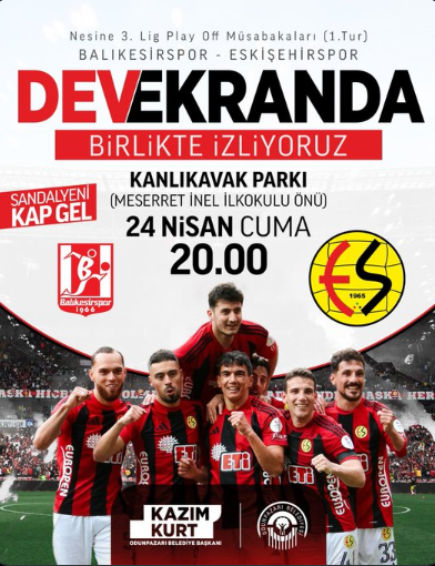 Öte yandan deplasman yasağı nedeniyle taraftarlar tribünde yer alamayacak. Ancak Kanlıkavak Parkı’nda kurulacak dev ekran sayesinde Eskişehirspor taraftarları maçı birlikte takip edebilecek. Taraftarların bir araya gelerek takımlarına destek vermesi amaçlanırken, birlik ve beraberlik vurgusu ön plana çıkıyor. Takımı yalnız bırakmamak adına organizasyonun önemine dikkat çekilirken, tüm taraftarlar Kanlıkavak’ta buluşmaya davet edildi.