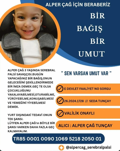 Serebral palsi (beyin felci) hastalığıyla mücadele eden 3,5 yaşındaki Alper Çağ Tunçay’ın yurtdışında olması gereken kök hücre nakil ameliyatı için destek çağrıları artarak devam ediyor. Tedavi sürecinin gecikmemesi büyük önem taşırken, minik Alper için zamanın giderek daraldığı ifade ediliyor.