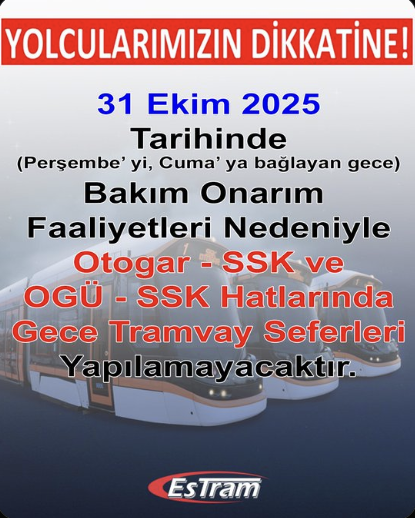 ESTRAM tarafından yapılan açıklamada, 31 Ekim 2025’te (Perşembe'yi Cuma'ya bağlayan gece) bağlayan gece planlanan bakım ve onarım faaliyetleri kapsamında “Otogar-SSK” ve “OGÜ-SSK” hatlarında gece tramvay seferlerinin geçici olarak iptal edileceği bildirildi.
