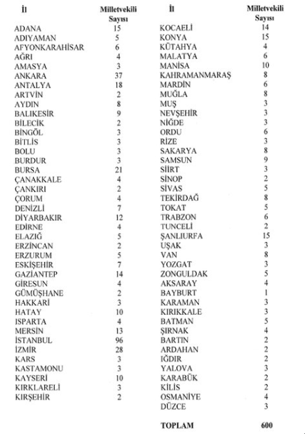 - Ankara (37 milletvekili) ve İstanbul (96 milletvekili) ise üç seçim çevresine bölündü.