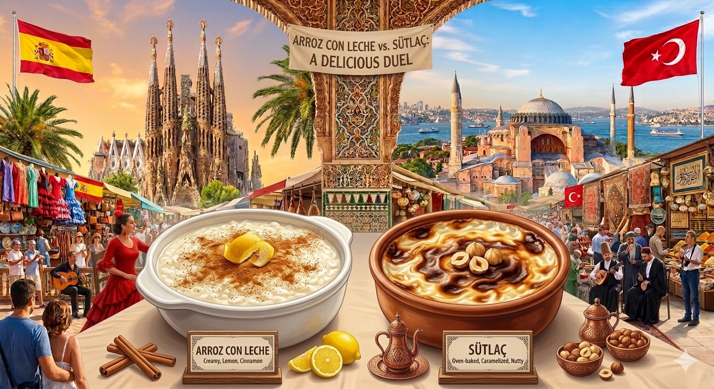 Arroz con Leche vs. Sütlaç: İspanyolların "sütlü pirinci". Tek farkı, onlar içine genellikle tarçın çubuğu ve limon kabuğu atarak aromalandırırlar; fırınlamak yerine tencerede yoğunlaştırırlar.