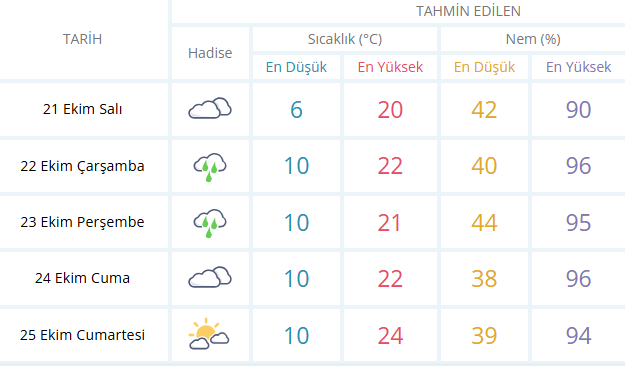 Meteoroloji 3. Bölge Müdürlüğü’nden alınan bilgilere göre, Eskişehir 21 Ekim Salı gününe çok bulutlu bir gökyüzüyle başlayacak. Kent merkezinde sabah saatlerinde 6 dereceye kadar düşen hava sıcaklığı, öğle saatlerinde 20 dereceye ulaşacak. Gün içinde yağış beklenmezken, özellikle sabah erken saatlerde yer yer sis ve pus olaylarının görülmesi öngörülüyor.