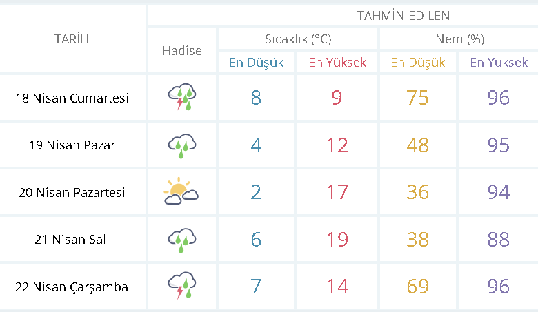 Eskişehir'de hafta başında sıcaklıklar mevsim normallerine dönmüşken, hafta sonu yeniden kentliler kışa geçiş yapacak. Hafta sonu planı olanlar hava durumuna bakmadan dışarıya çıkmayın. Meteoroloji Genel Müdürlüğü tarafından yapılan tahminlerde Eskişehir'de sıcaklıklar 4 ila 6 derece birden düşecek. Bugün hava sıcaklığının 10 derecenin altında olması beklenirken, gün boyu sağanak yağış etkili olacak. 18 Nisan 2026 Pazar günü de sağanak yağış etkisini devam ettirecek.