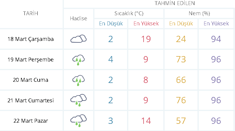 19 Mart Arife Günü ile 20, 21 ve 22 Mart tarihlerinde kutlanacak Ramazan Bayramı boyunca ise kent genelinde soğuk ve yağışlı havanın etkisini sürdürmesi öngörülüyor. Hava sıcaklıklarının özellikle gece saatlerinde 2 dereceye kadar gerileyebileceği ifade ediliyor.