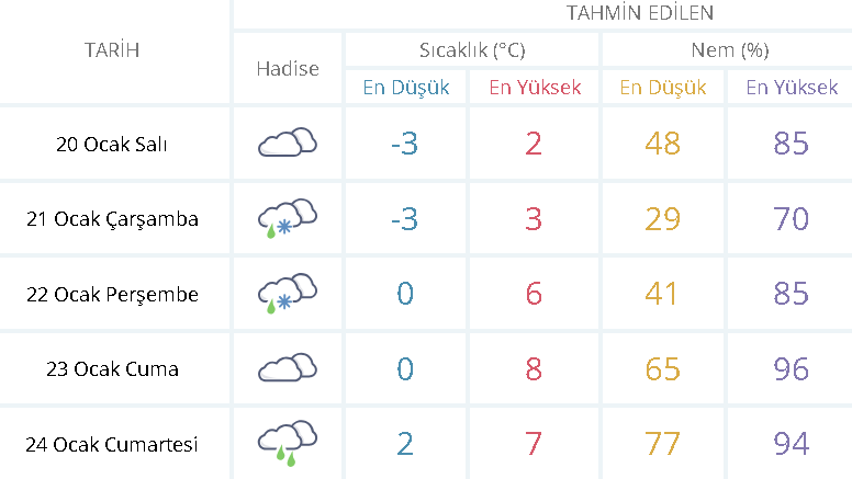 Tahminlere göre Eskişehir’de en düşük sıcaklık -1 derece ile Mihalıççık ve Han ilçelerinde, en yüksek sıcaklıklar ise Sarıcakaya ve Mihalgazi ilçelerinde ölçülecek. Yetkililer, sürücüler başta olmak üzere vatandaşları olumsuz hava koşullarına karşı tedbirli olmaları konusunda uyardı.