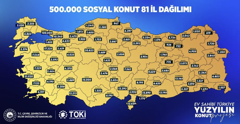 “Yüzyılın Konut Projesi” olarak tanımlanan bu büyük yatırım, özellikle dar gelirli aileler için yeni bir yaşam umudu olacak. Projenin tamamlanmasıyla birlikte Eskişehir’de binlerce vatandaş uygun ödeme koşullarıyla ev sahibi olma imkânına kavuşacak. Eskişehir'in çevre illerinde de inşa edilecek. Bilecik'te bin 419, Afyonkarahisar'da 4 bin 370, Bursa'da da 17 bin 225 konut inşa edilecek.