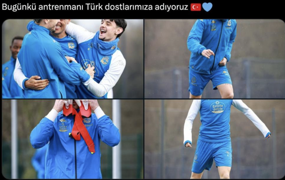 La Liga 2’de mücadele eden Deportivo, resmi sosyal medya hesaplarından Türkçe olarak “Bugünkü antrenmanı Türk dostlarımıza adıyoruz” mesajını paylaştı. Bu paylaşıma Eskişehirspor cephesinden de gecikmeden yanıt geldi. Kırmızı-siyahlı kulüp, paylaşımı alıntılayarak Türkiye ve İspanya bayraklarının yer aldığı bir görselle iki ülke arasındaki dostluğa vurgu yaptı.